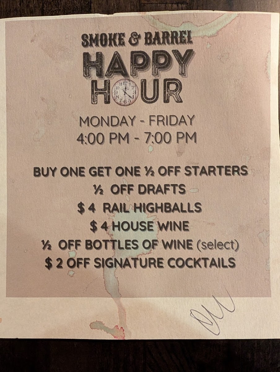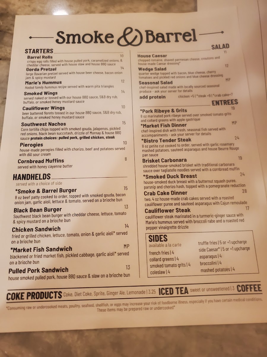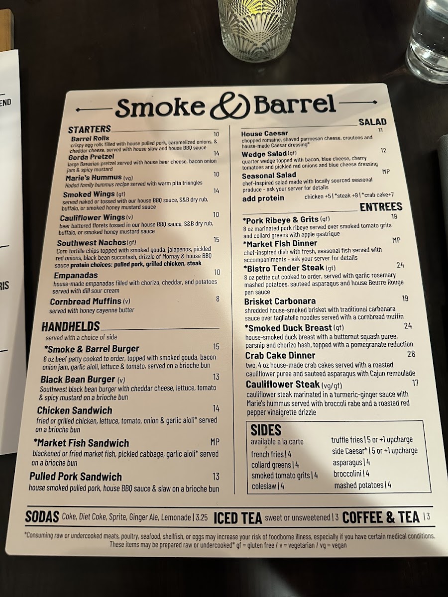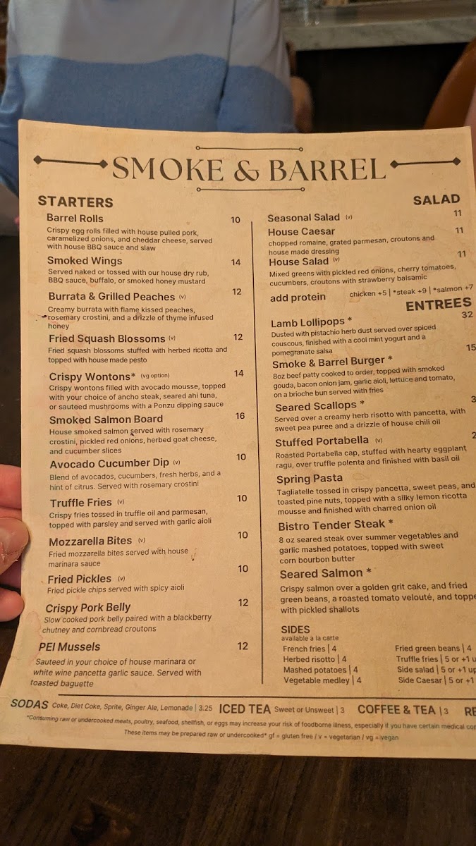 The menu at Smoke And Barrel offers a diverse range of dishes that are sure to satisfy a variety of tastes. For starters, guests can indulge in options like the refreshing Avocado Cucumber Dip, crispy Basket Truffle Parmesan Fries, or savory Barrel Rolls. If you're in the mood for something lighter, the Burrata & Grilled Peaches and Fried Squash Blossoms are excellent choices. Moving on to the entrees, the restaurant presents an impressive selection including the flavorful Spring Pasta, tender Lamb Lollipops, and the juicy Bistro Tender Steak. Vegetarians can enjoy the hearty Stuffed Portabella, while those seeking a classic American dish can opt for the delicious Smoke & Barrel Burger. For sides, you can choose from a variety of options such as Sd. French Fries, Sd. Truffle Fries, or Sd. Herb Risotto. To complement the meal, the restaurant also offers fresh salads like the Seasonal Salad, House Salad, and the ever-popular Caesar Salad. Desserts at Smoke And Barrel include sweet treats like Cheesecake, warm Beignet, and decadent Chocolate Lava Cake. Whether you're stopping by for a casual meal or a special occasion, the diverse menu ensures there’s something for everyone.